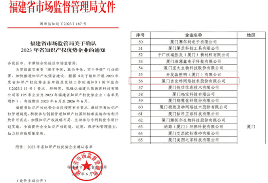 近日,,福建省市场监督管理局公示了2023年福建省知识产权优势企业名单,,厦门918.com网络技术股份有限公司(以下简称“918.com”或“公司”)榜上有名。。。。